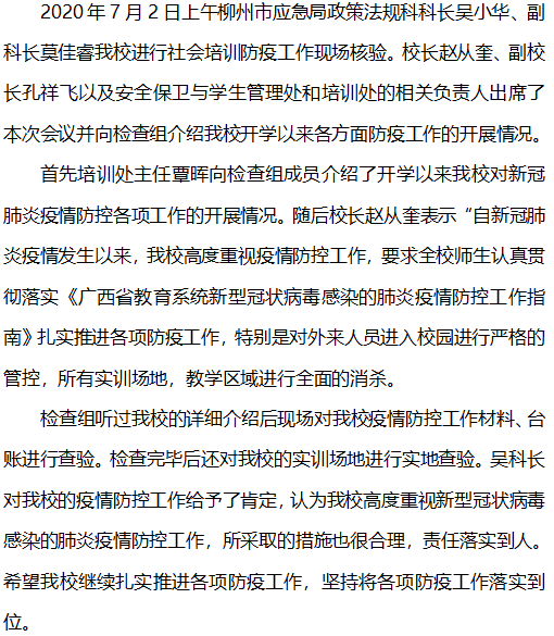柳州市应急局对我校社会培训防疫工作进行现场核验