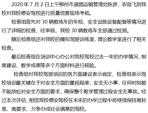 柳州市道路运输管理处对我校德安驾校进行质量信誉考核