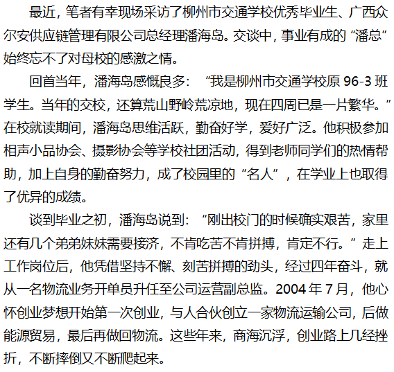 柳州市交通学校建校35周年优秀毕业生系列报道: 师恩铭记者 时代追梦人 ——记广西众尔安供应链管理有限公司 广西润众研学教育管理集团 总经理潘海岛
