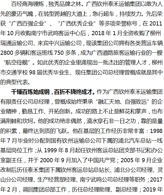 柳州市交通学校建校35周年优秀毕业生系列报道: 志存高远 敢为人先 ——记广西钦州泰禾运输集团有限责任公司总经理曾概成