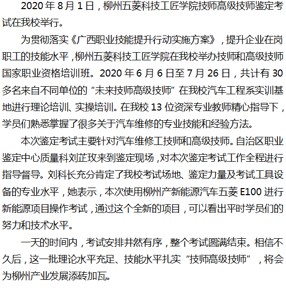 柳州五菱科技工匠学院 在我校举行技师高级技师鉴定考试
