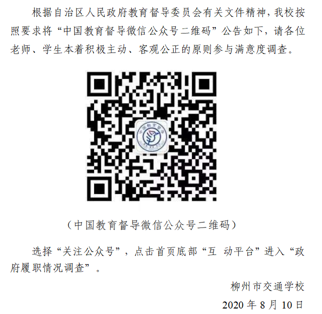 柳州市交通学校关于扫描“中国教育督导微信公众号二维码”开展满意度调查的公告