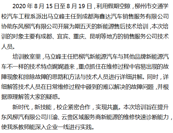 校企紧密合作 实现共赢 —东风柳汽川渝、云贵区域技术培训