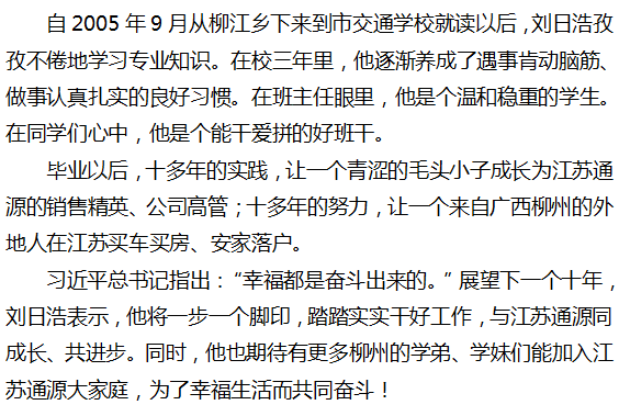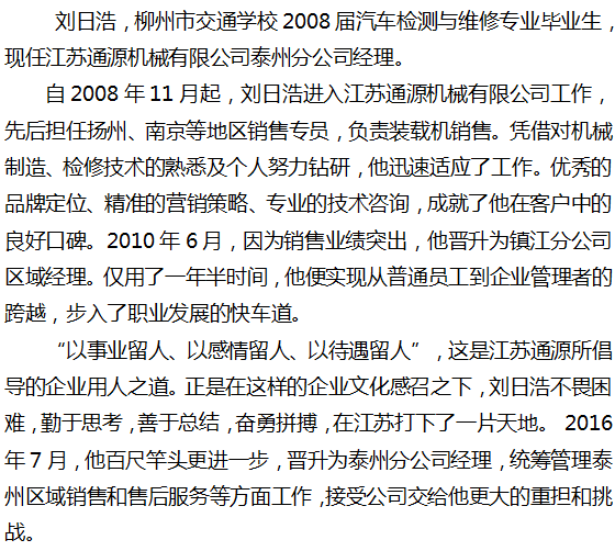 柳州市交通学校建校35周年优秀毕业生系列展示之七: 勇于拼搏 成就精彩人生 ——记江苏通源机械有限公司泰州分公司经理刘日浩