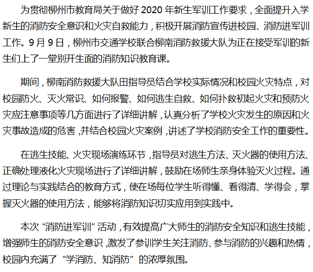 柳州市交通学校开展“消防进军训”活动