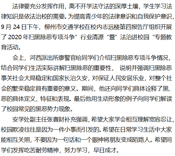 警校协同发力 共建法治校园 柳州市交通学校开展2020年扫黑除恶专项斗争“行业清源“暨” 法治进校园“专题教育