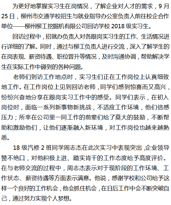 在学习中提升,在实践中成长 ——柳州市交通学校开展2018级实习回访工作