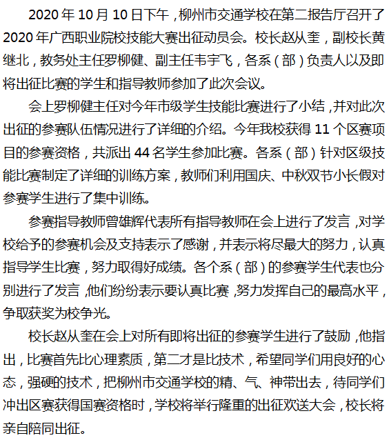 柳州市交通学校 召开2020年广西职业院校技能大赛出征动员会