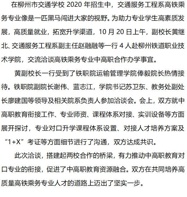 拓宽专业升学渠道 助力学生高质量发展 ——柳州市交通学校与铁道职业技术学院高铁乘务专业中高职合作办学交流洽谈