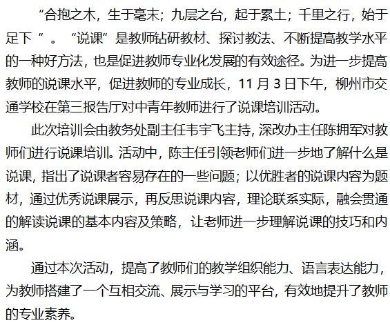 以“说”促“教” 提高课堂教学水平 ——记柳州市交通学校说课培训活动