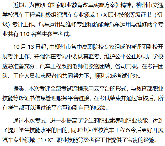响应国家号召 提升自身技能 ——柳州市交通学校汽车工程系开展2020年汽车专业领域“1+X”职业技能等级证书(初级)考评