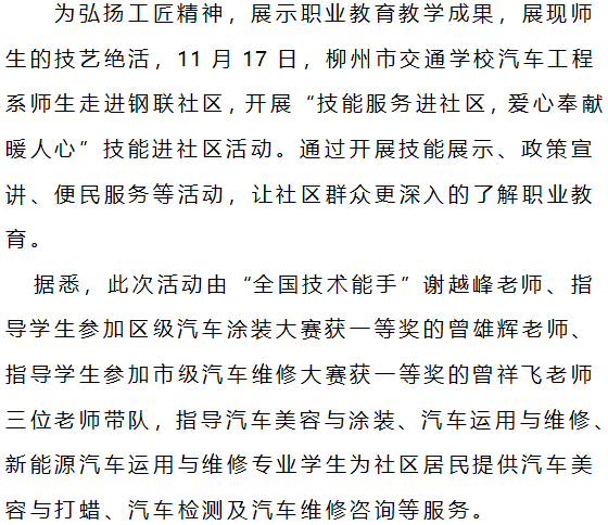 技能服务进社区,爱心奉献暖人心 ——柳州市交通学校汽车工程系技能进社区活动