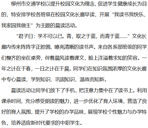 风声雨声读书声声声入耳 --记柳州市交通学校校园文化长廊晨读活动