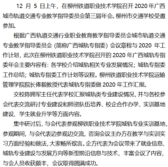 以开放型教学研究交流丰富学校发展内涵 —— 市交通学校参加2020年广西城市轨道交通专业教学 指导委员会第三届年会报道