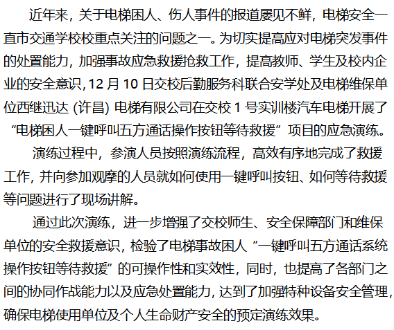 市交通学校开展电梯困人一键呼叫五方通话 系统操作按钮等待救援演练