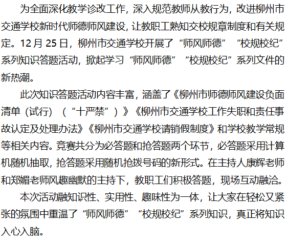 柳州市交通学校举行“师风师德”“校规校纪” 系列知识答题活动