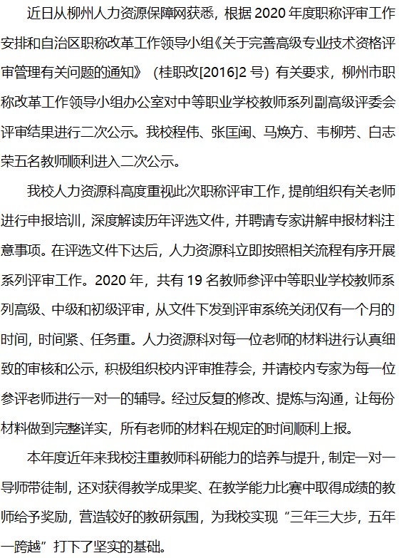 柳州市交通学校五名教师参评中等职业学校 教师系列副高职称顺利进入二次公示