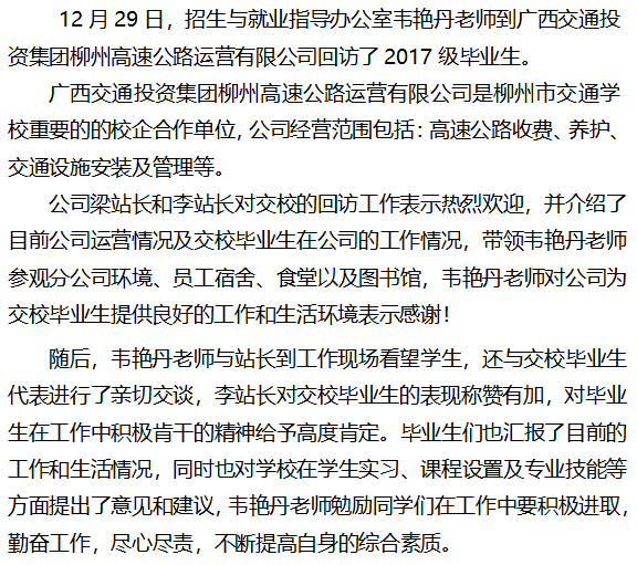 寒冬送温暖,回访暖人心 --柳州市交通学校赴柳州高速公路运营有限公司回访毕业生