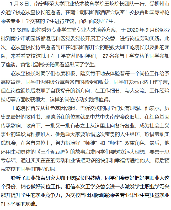 职业教育大咖王屹院长一行看望勉励柳州市交通学校国际邮轮乘务专业工学交替学生