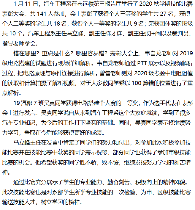 胜不骄败不馁 选人才树榜样 ——汽车工程系举行2020秋学期技能比赛表彰大会