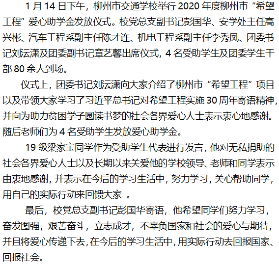 柳州市交通学校举行2020年度 柳州市“希望工程”爱心助学金发放仪式
