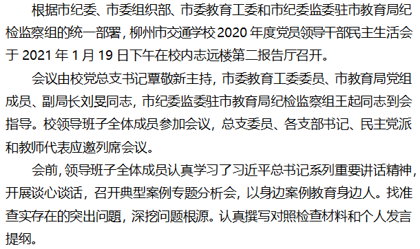 柳州市交通学校召开2020年度党员领导干部民主生活会