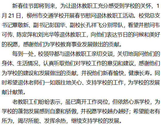 昔日育桃李 今朝乐晚年 殷殷祝福声 句句安师情 ——柳州市交通学校开展春节前慰问退休教职工活动