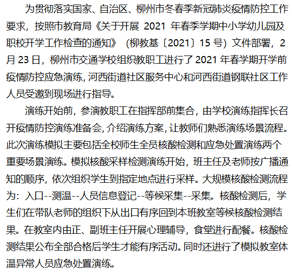 柳州市交通学校开展2021年春季开学前疫情防控演练