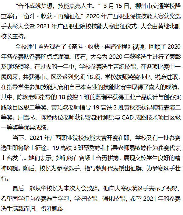 奋斗・收获・再踏征程 --市交通学校2020年广西职业院校技能大赛获奖选手 表彰大会暨2021年广西职业院校技能大赛出征仪式