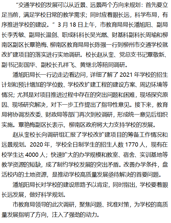 聚焦问题 推动发展 柳州市教育局局长潘旭阳一行到市交通学校调研