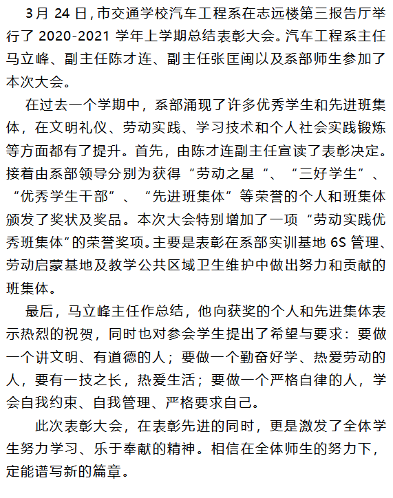 树典型 立榜样——市交通学校汽车工程系举行2020-2021学年上学期总结表彰大会