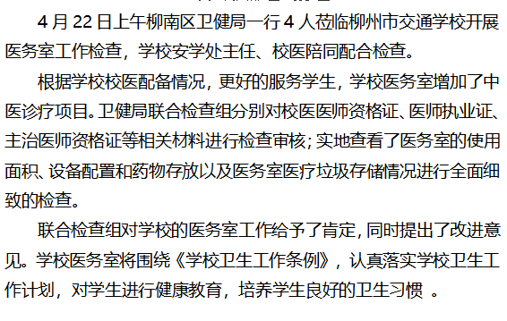 柳南区卫健局到柳州市交通学校开展医务室工作检查