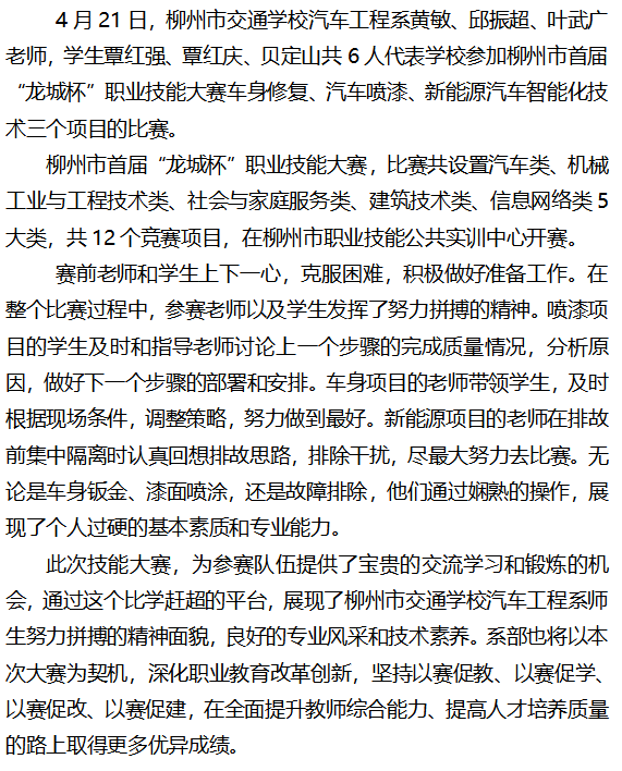 以赛促成长 师生展风采 ——汽车工程系师生参加柳州市首届“龙城杯”职业技能大赛侧记