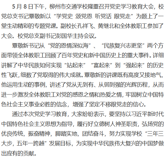 党史故事大家讲学党史 感党恩 跟党走 --柳州市交通学校召开党史学习教育大会