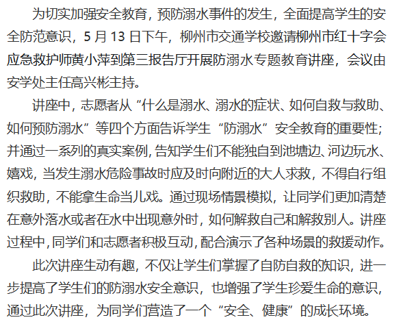 我为群众办实事|珍爱生命 远离溺水 --柳州市交通学校开展防溺水专题教育讲座