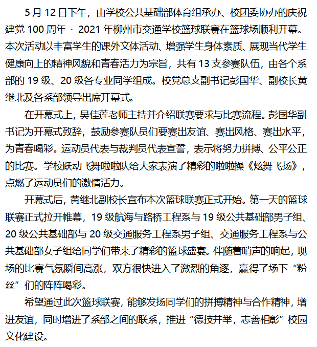 庆祝建党100周年|放飞青春 迎篮而上 --柳州市交通学校篮球联赛顺利开幕