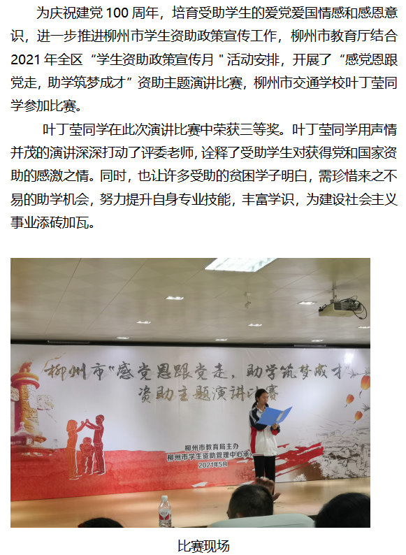 柳州市交通学校参加“感党恩跟党走,助学筑梦成才”资助主题演讲比赛