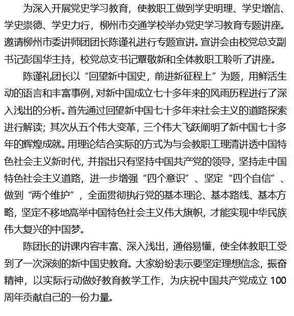 党史故事大家讲|党史知识专题培训|回望新中国史,前进新征程上 --柳州市交通学校开展党史学习教育专题讲座