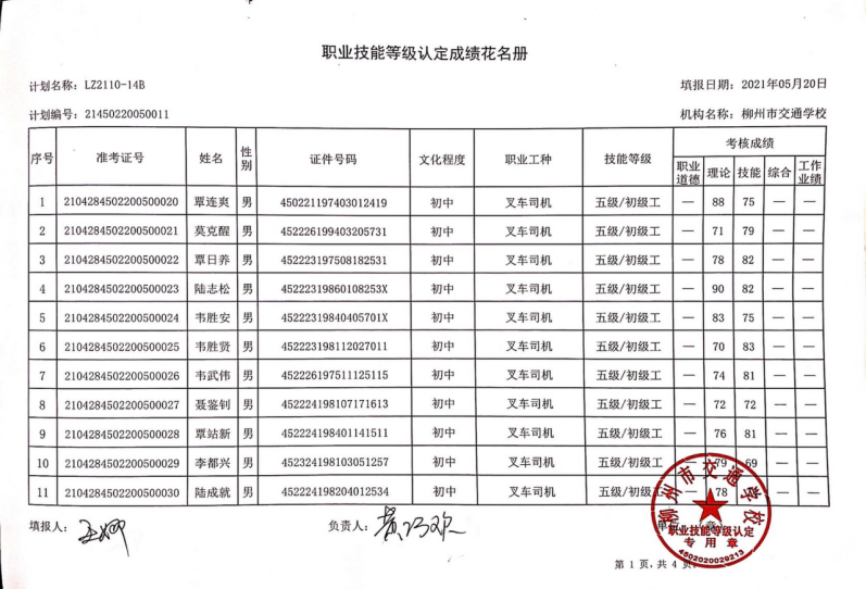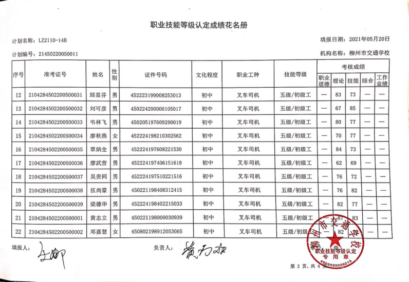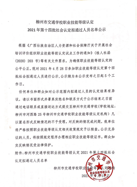 柳州市交通学校职业技能等级认定 2021年第十四批社会认定拟通过人员名单公示