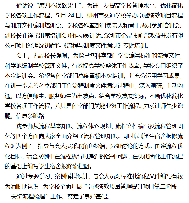 柳州市交通学校举办卓越绩效项目 流程与制度文件编制培训会