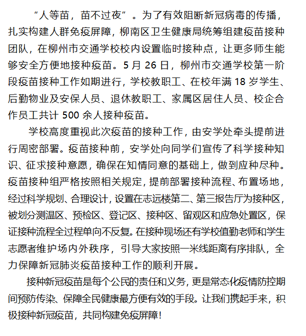 我为群众办实事|柳州市交通学校新冠疫苗接种工作顺利开启