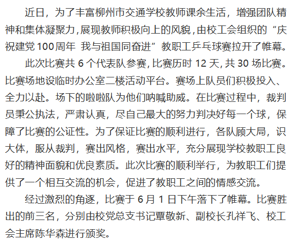 庆祝建党100周年 我与祖国同奋进 --柳州市交通学校举办教职工乒乓球赛
