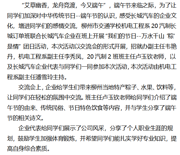 我们的节日|万水千山“粽”是情 柳州市交通学校20汽制长城订单班开展团日活动