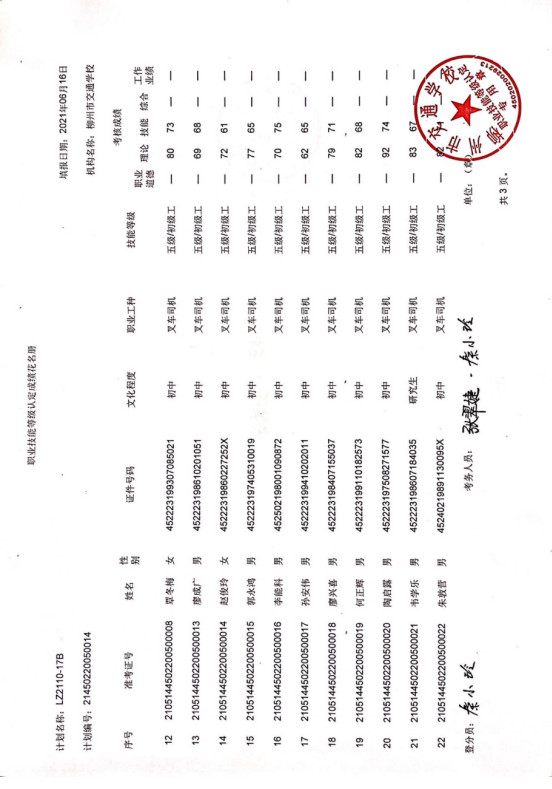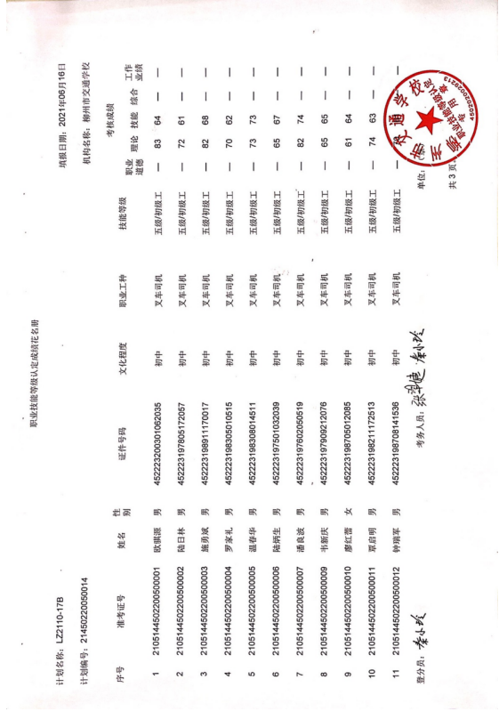 柳州市交通学校职业技能等级认定2021年第十七期叉车初级认定拟通过人员名单公示