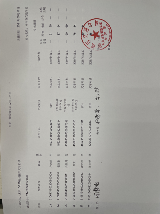柳州市交通学校职业技能等级认定2021年第二十三期叉车初级认定拟通过人员名单公示