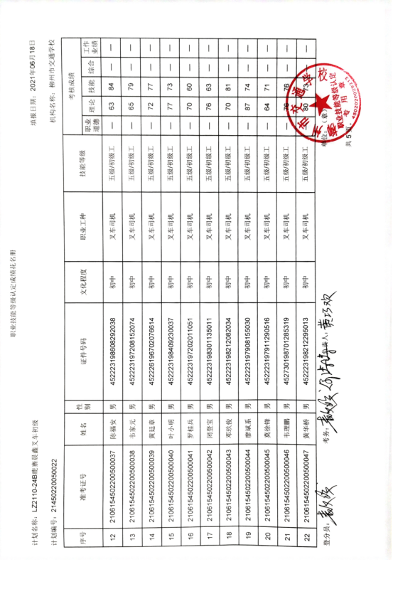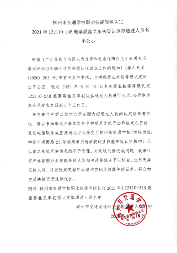 柳州市交通学校2021年LZ2110-24B鹿寨晨鑫叉车初级认定拟通过人员名单公示