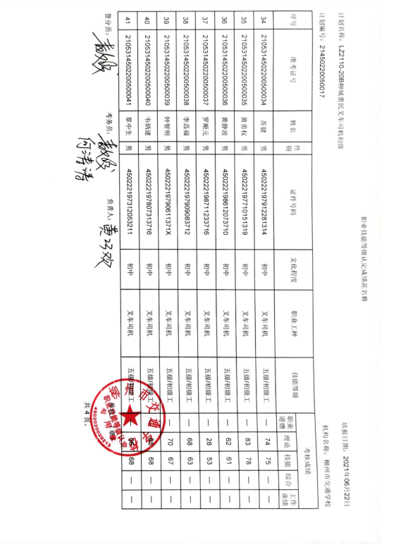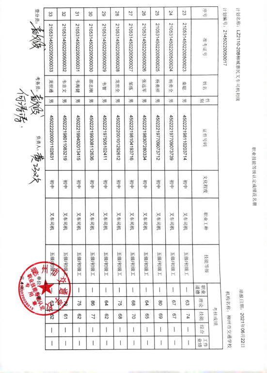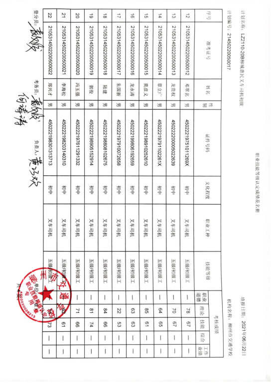 柳州市交通学校职业技能等级认定2021年LZ110-20B柳城惠民叉车初级认定拟通过人员名单公示