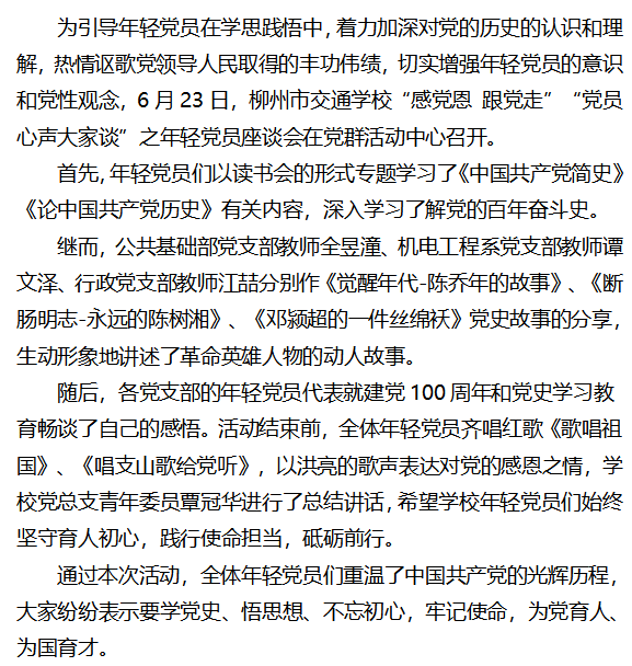 感党恩 跟党走 党员心声大家谈 --柳州市交通学校召开年轻党员座谈会