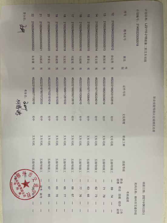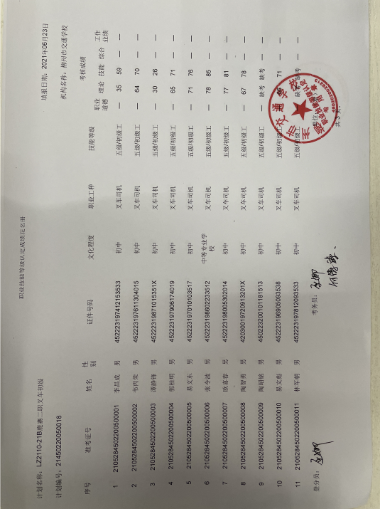 柳州市交通学校职业技能等级认定2021年第二十一期叉车初级认定拟通过人员名单公示