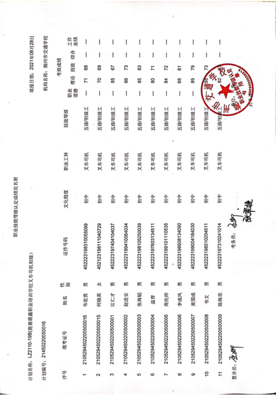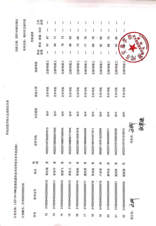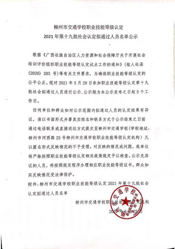 柳州市交通学校职业技能等级认定2021年第十九期叉车初级认定拟通过人员名单公示